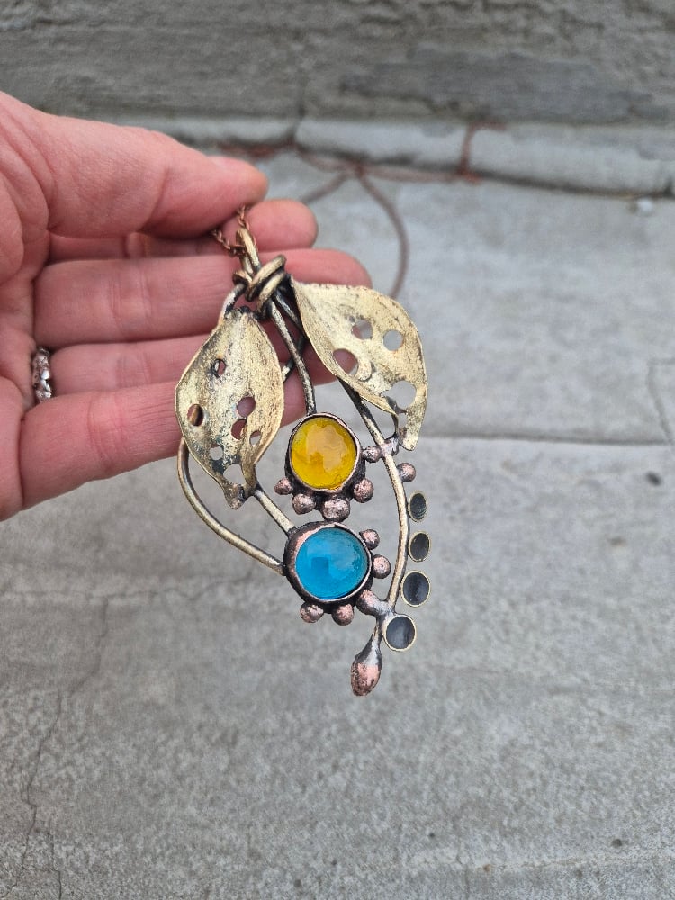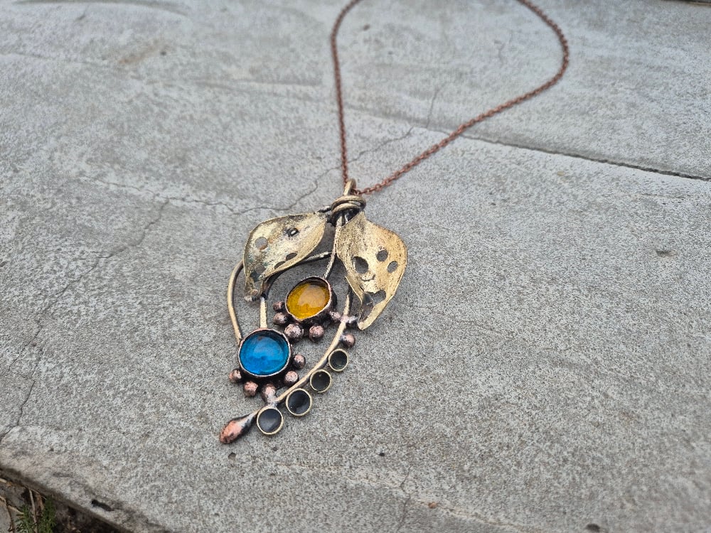 I made this necklace of copper, brass, bullet cussings and glass cabochon