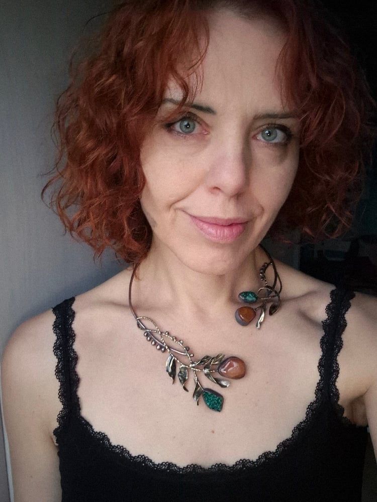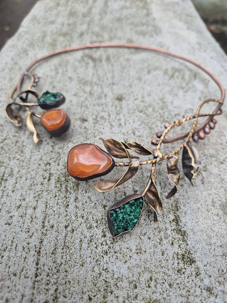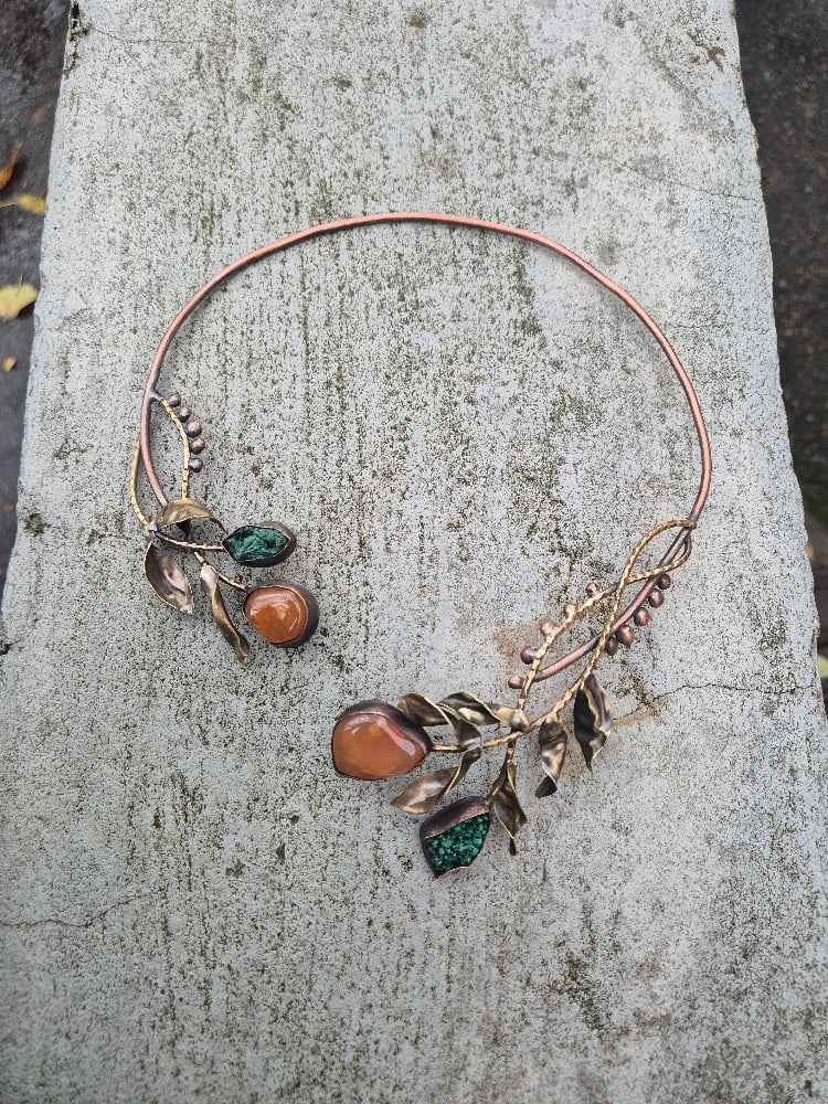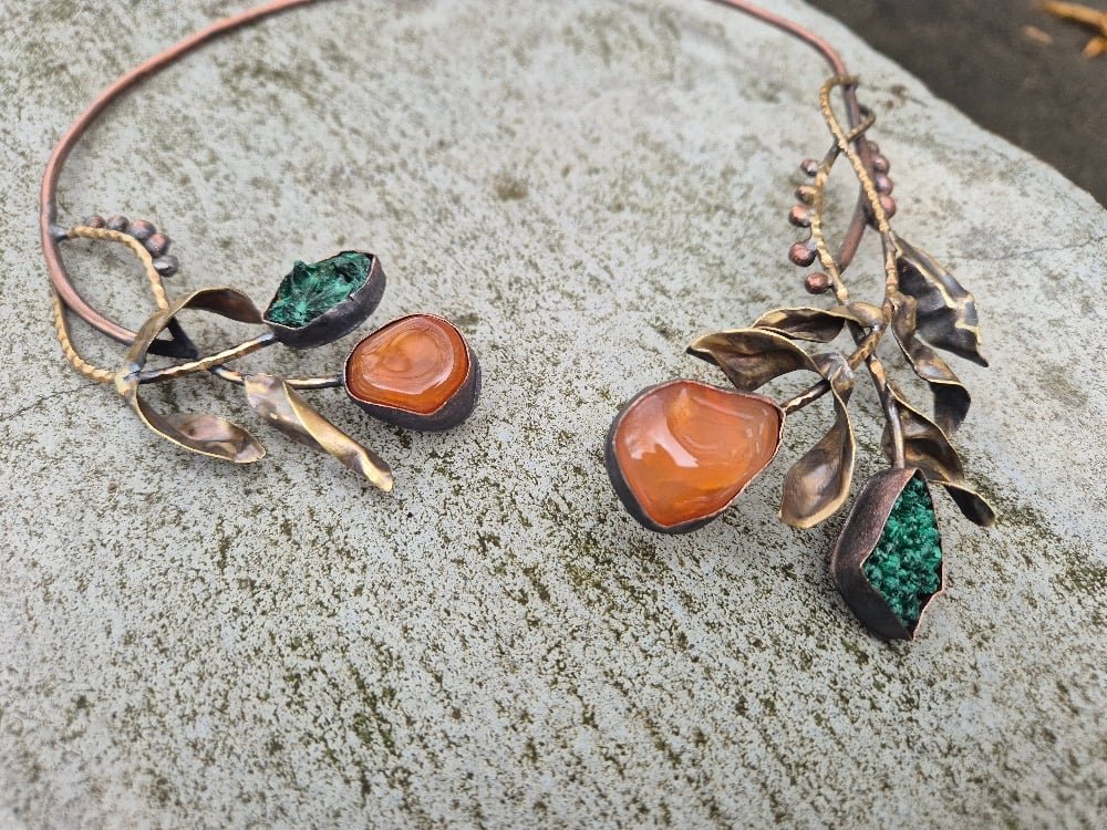 I made this necklace of copper, brass, bullet casings, carnelian and malachite