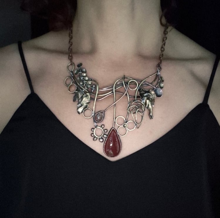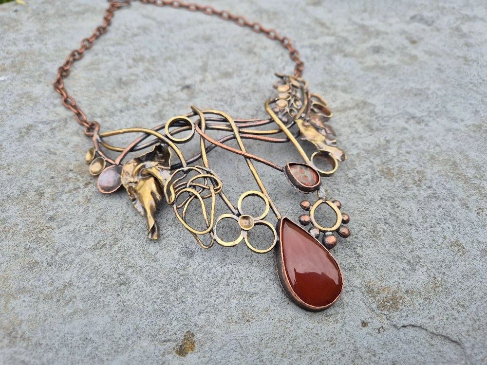 I made this necklace of copper, brass, bullet casings, carnelian and jasper