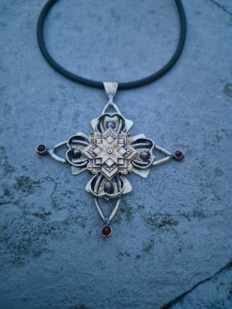 I made this pendant of copper, brass, bullet casings, glass beads and brass central detail