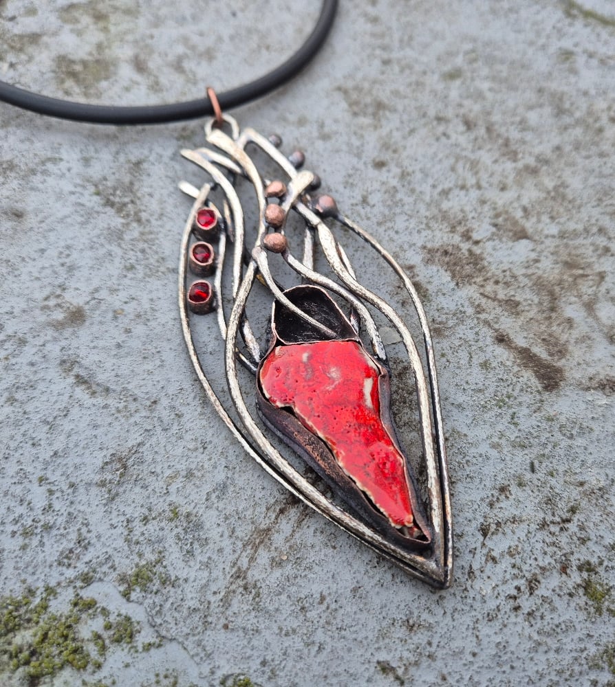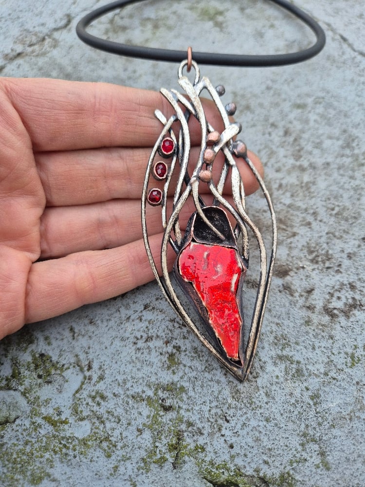 I made this necklace of copper, german silver, ceramic cabochon and glass beads