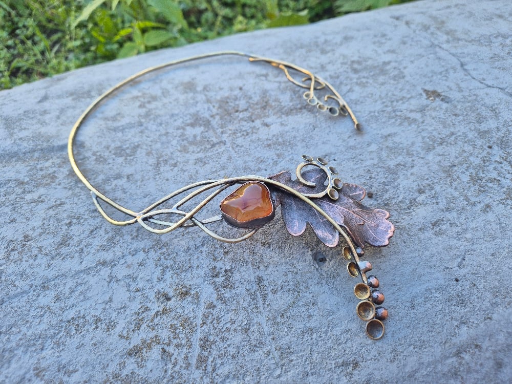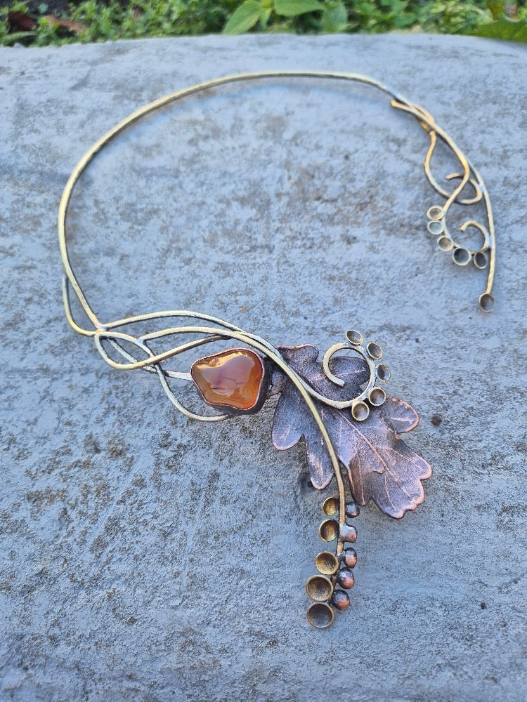 I made this necklace of copper, brass, bullet casings, real oak leaf and carnelian