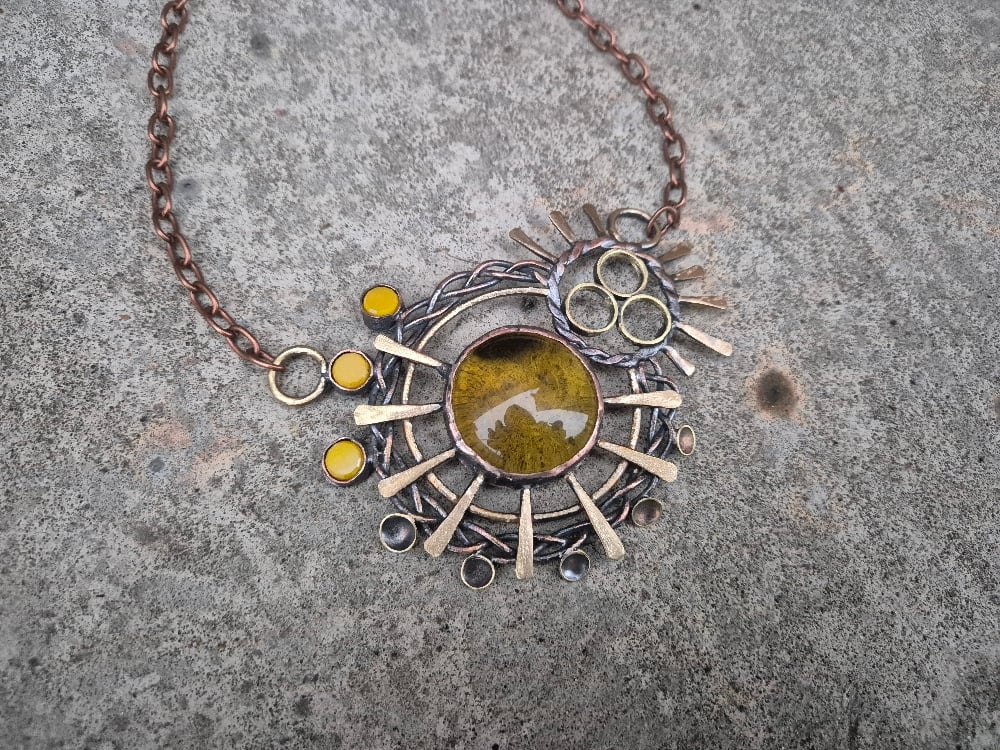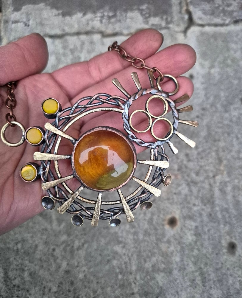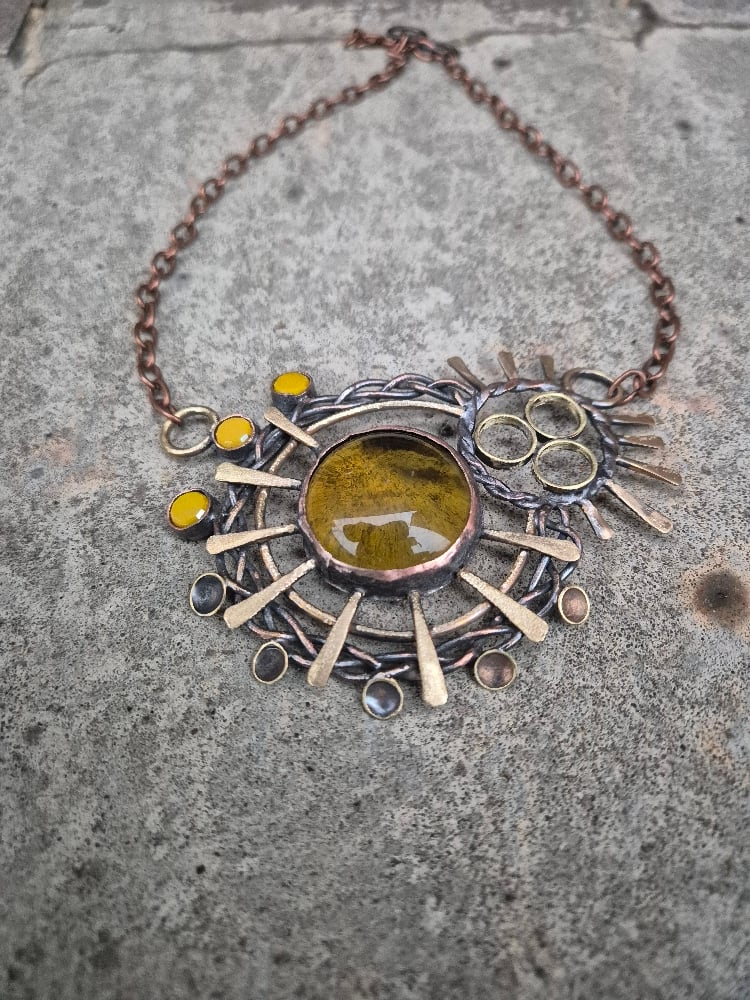 I made this necklace of copper, brass, bullet casings, glass cabochon and glass beads