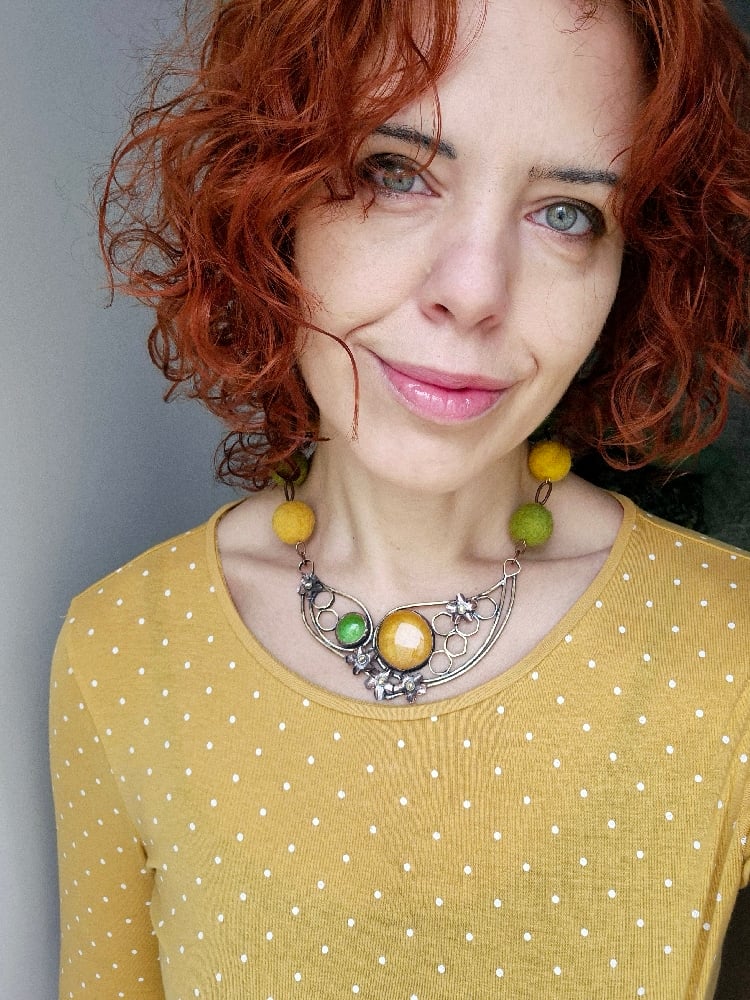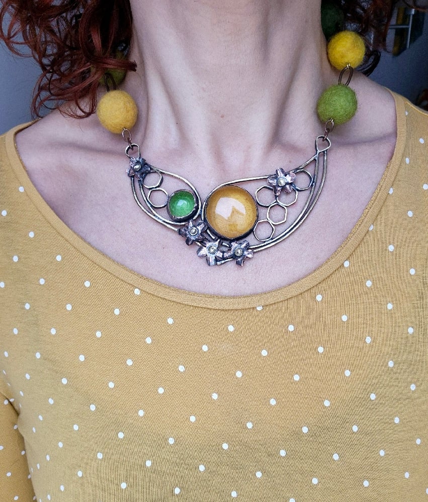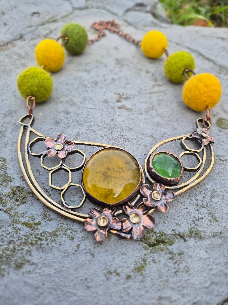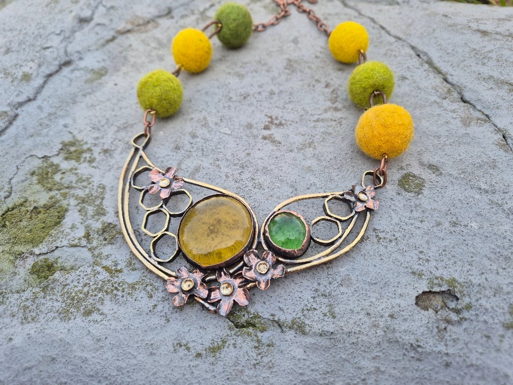 I made this necklace of copper, brass, glass cabochons and felt beads
